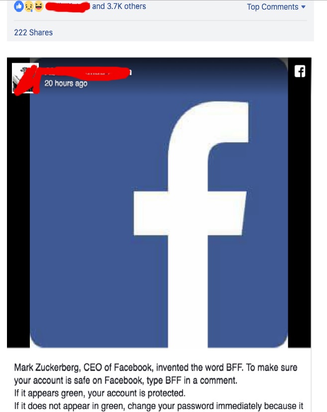Mark Zuckerberg, CEO of Facebook, invented the word BFF. To make sure your account is safe on Facebook, type BFF in a comment. If it appears green, your account is protected. If it does not appear in green, change your password immediately because it will be hacked.